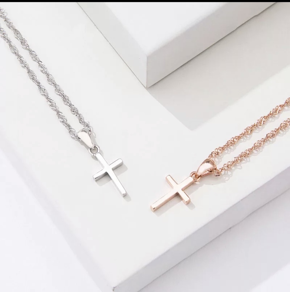 Our Simple Elegant Standanrd Stainless Steel Cross Pendent . Rose gold pictured, also available in yellow gold 14k plated. Size 21 mm x 13 mm.